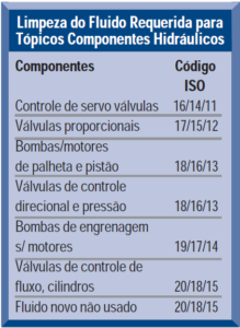 Em sistemas hidráulicos utilizam-se os seguintes parâmetros para definir qual o limite de contaminação deve haver no seu sistema. Obs.: Nesta tabela falamos de contaminantes sólidos.