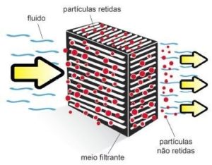 Para tipos de meio filtrantes de profundidade, o fluido deve tomar caminhos indiretos através do material que forma o meio filtrante. As partículas são depositadas nas aberturas em forma