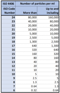 Nesta tabela temos o número de partículas correspondentes a cada número da escala ISO, por exemplo, se na amostra de óleo foram detectadas 1500 partículas por ml, o número correspondente seria o 18, que compreende o número de partículas entre 1300 e 2500 por ml.