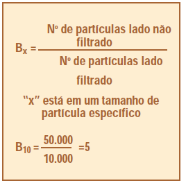 A Razão Beta, também conhecida como a razão filtragem, é a medida da eficiência de captura de partículas por um elemento de filtro. Ela é, portanto, uma razão de desempenho. Como um exemplo de como a Razão Beta é derivada do Teste de Múltipla Passagem, assuma que 50.000 partículas, 10 mícrons e maiores, foram contadas no lado não filtrado do filtro de teste e 10.000 partículas da mesma faixa de tamanho foram contadas no lado filtrado do filtro de teste. A Razão Beta correspondente seria igual a 5, como visto no seguinte: