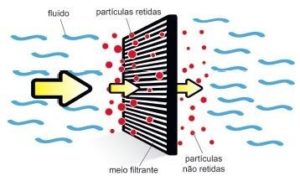 de labirinto por todo o meio filtrante. Por causa de sua construção, um meio filtrante tipo profundo tem muitos poros de vários tamanhos. Dependendo da distribuição dos tamanhos dos poros, este meio filtrante pode ter uma alta faixa de captura de partículas com tamanhos pequenos. A natureza do meio filtrante e o processo de entrada do contaminante no elemento do filtro explica porque alguns elementos duram muito mais do que outros. Em geral, o meio filtrante contém milhões de pequeníssimos poros formados pelas fibras do meio filtrante.